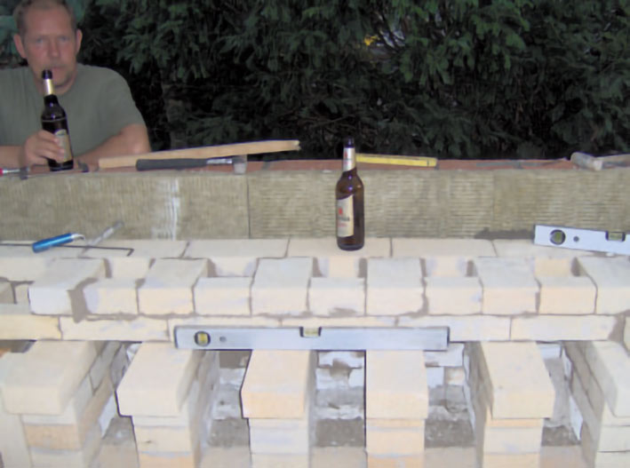 Die erste Frage, die man sich beim Aufstellen eines Ofens stellen muss, ist die nach dem Heizmaterial. Im Märchenwald gibt es viel Holz. Somit musste also nur noch der Schornsteinfegermeister hinter den sieben Bergen seine Zustimmung bekunden, damit die fleißigen Heinzelmännchen loslegen konnten. Durch den gewünschten Einsatz von Holz als Brenngut war die Konstruktion der Brennkammer im Ofen vorgegeben. Da der Ofen in Handarbeit errichtet wird, ist die alte Bauweisheit „Ein Stein – ein Kalk – ein Bier“ noch gültig.