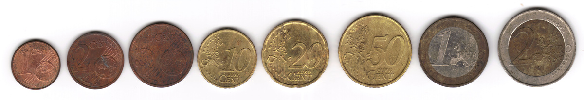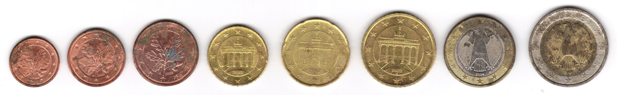 Die 10 – 50 Cent Stücke haben das Jahr fast ohne Veränderungen an der Oberfläche überstanden. Das „Nordische Gold“ scheint hier fast unverwüstlich zu sein. Leichte Rostflecke und etwas Glanzverlust kann man an allen drei Stücken beobachten. Beim 50 Cent Stück blieb ein Kratzer (WS oben rechts) ohne einen Ansatz von Korrosion.